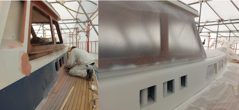Inmiddels staat de opbouw ook in de primer en we staan echt versteld van het resultaat. Zeker in combinatie met het teakdek dat inmiddels al vergevorderd is. Ook deze mannen zijn ware kunstenaars. Wat een vakwerk is dit en hoe gaaf om er tot in detail zoiets moois van te maken. Superknap! Helaas is al het timmerwerk nu even stilgelegd omdat dat veel stof geeft en de schilders alles hebben schoongemaakt om te gaan spuiten. Helaas is er de komende dagen kans op regen dus gebeurt er even niets.