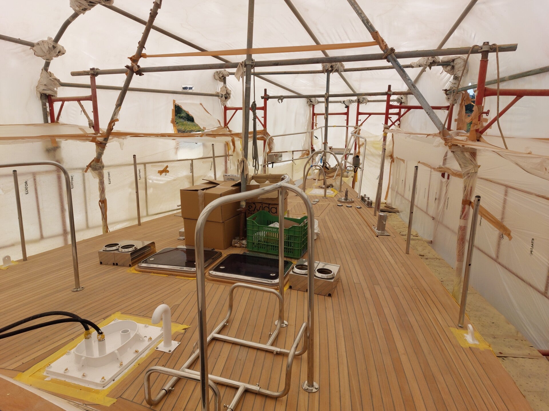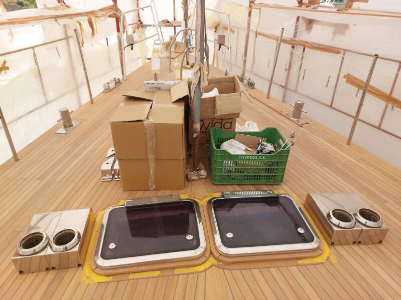 De basis voor de lieren op het achterdek is klaar en wordt vandaag op het dek gelast zodat de houten cover en de kuipbank eindelijk geïnstalleerd kunnen worden. We zijn vanmorgen langs geweest en er werd ook daadwerkelijk gewerkt dus hopelijk kan de timmerman maandag aan de slag met de bank.
